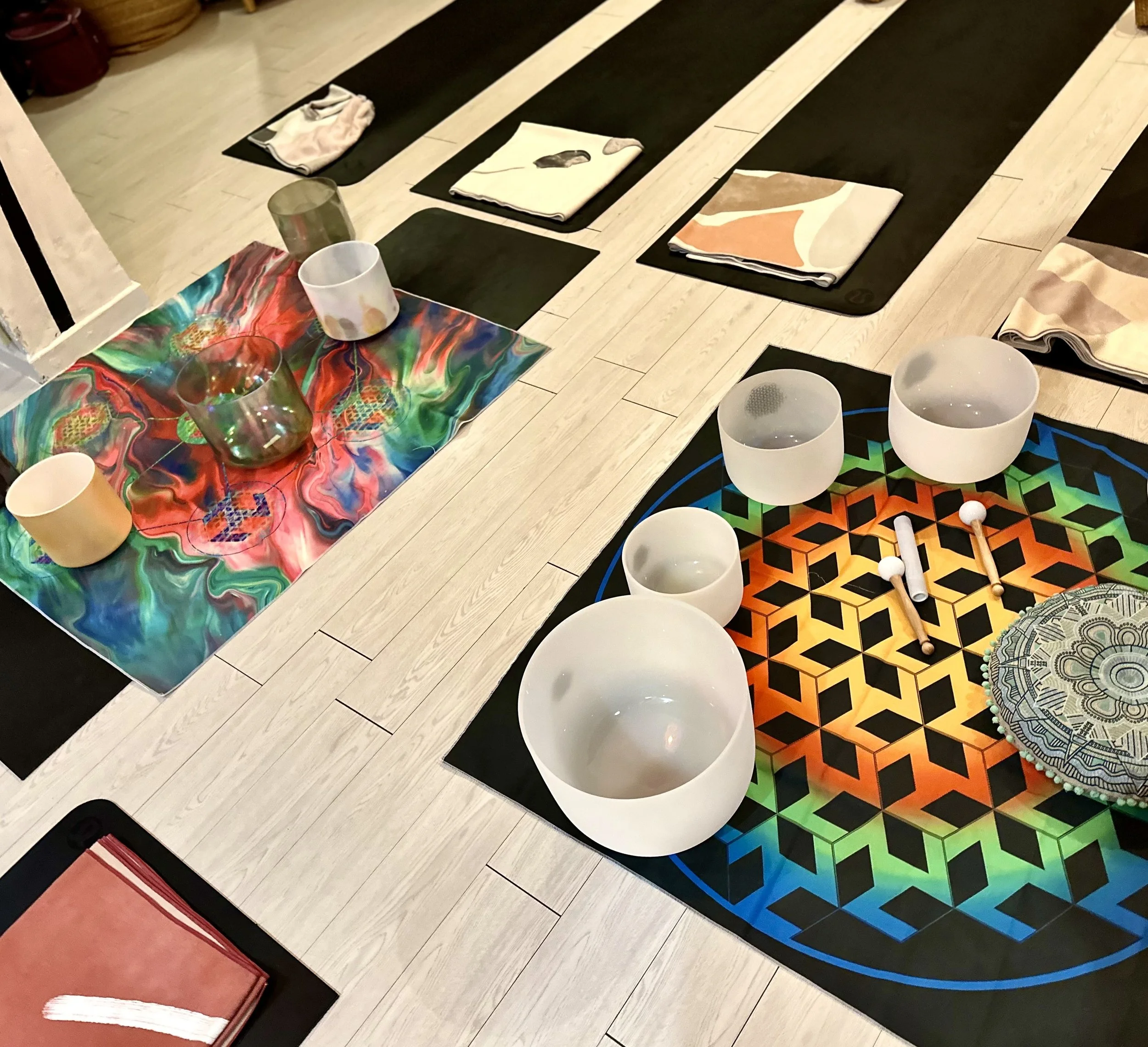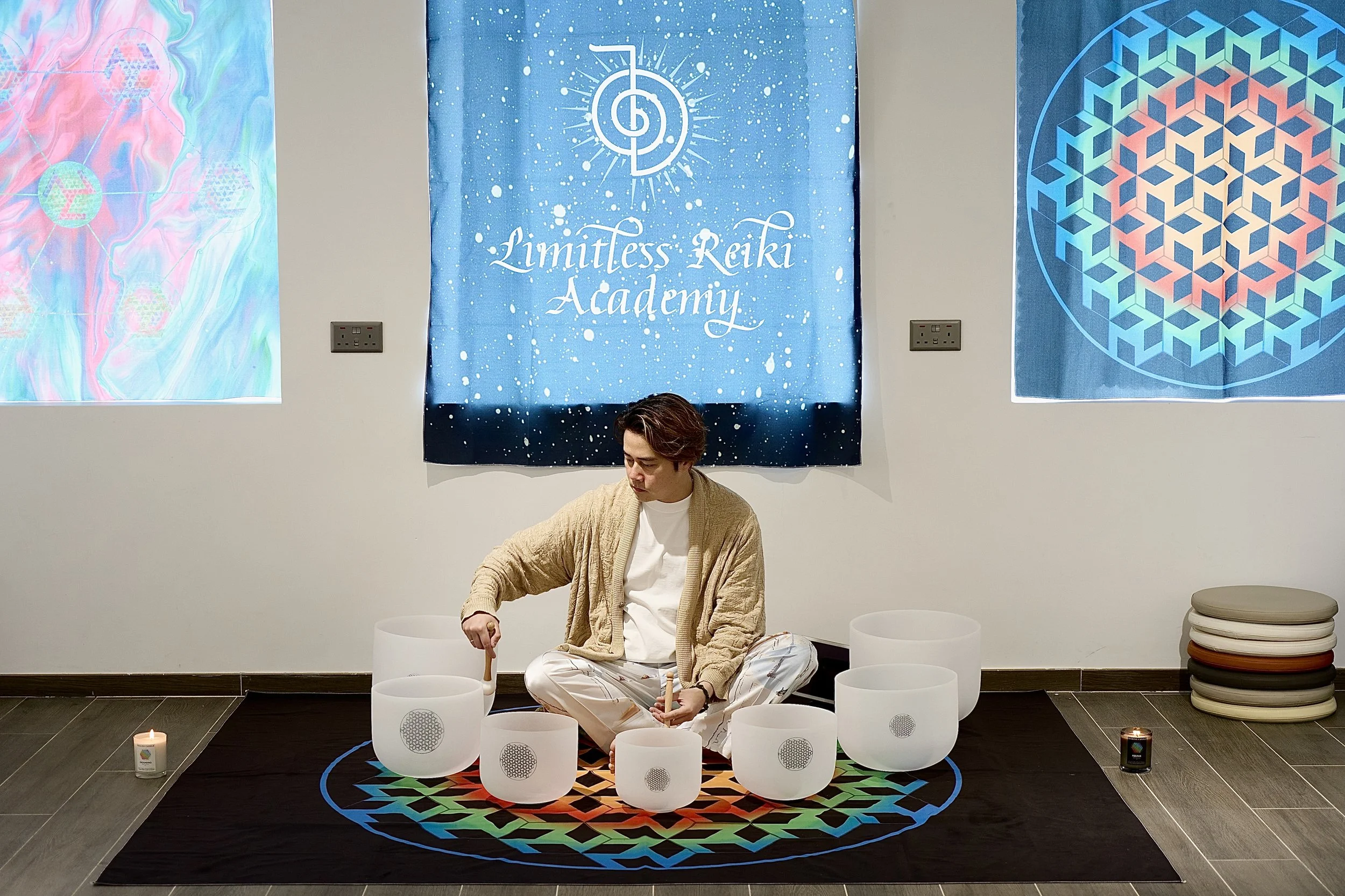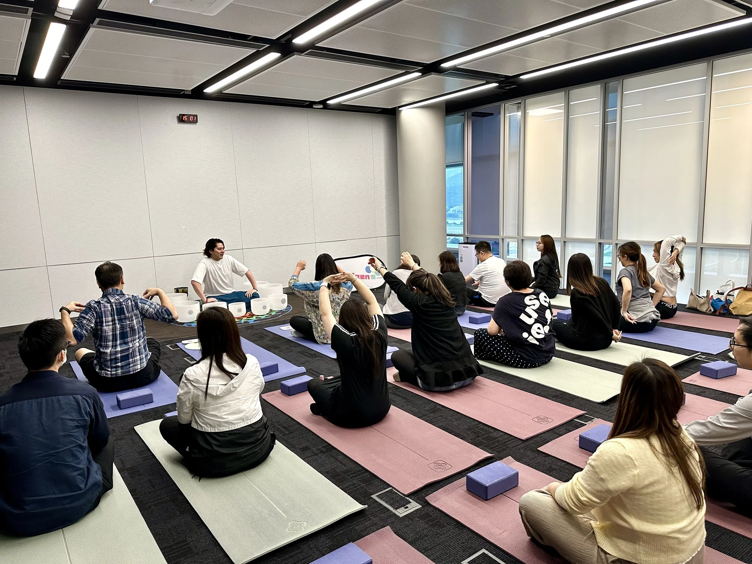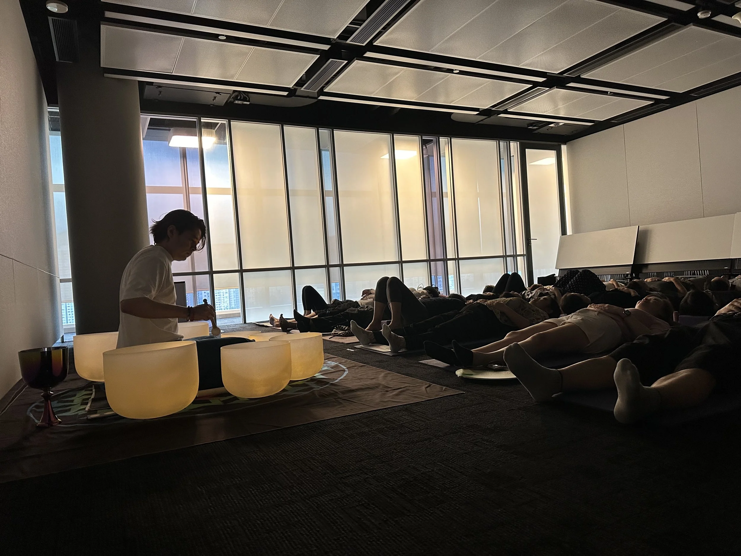 導師引導參加者進行接地冥想,體驗水晶頌缽聲音浴(Sound Bath),讓大家得到休息及療癒。
